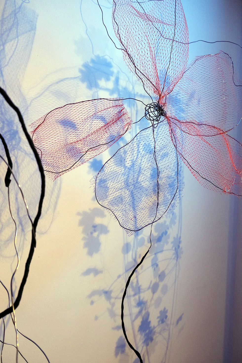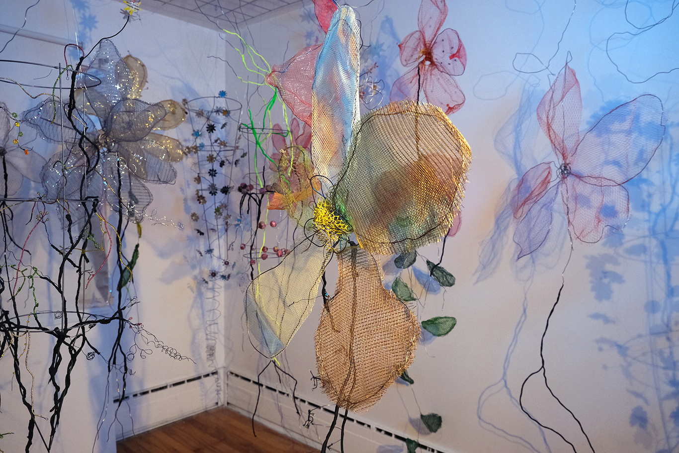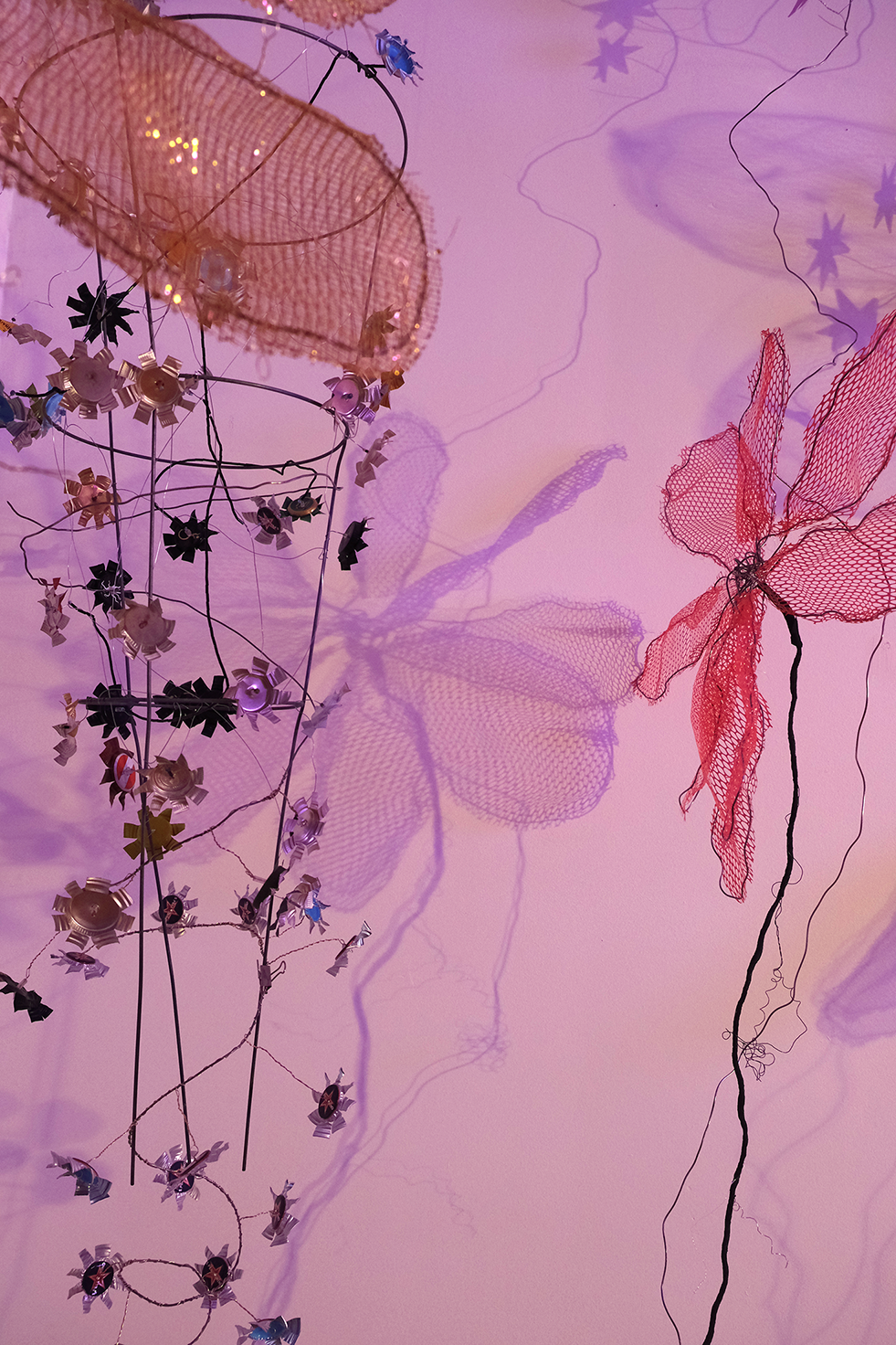 While the world descends into chaos, I retreat into my studio-world, a space set up to freeform collected materials into new shapes. Inspired by amateur crafting, maquette building, recycling and nature, hours are spent searching for new ways to transform my collected materials. At the end of each work session, when materials proved inert, heavy, opaque and the results belabored and nowhere near the effect of lightness I was striving for, I remain confident something surprising might happen. In my efforts to remove weight from the structures, I practice greater patience with my failures and even begin to enjoy the soothing doing and undoing. My focus begins to shift away from results, trading expectation for learning new modest skills, for curiousity about how it will come together from within, rather than from an outward vision.
